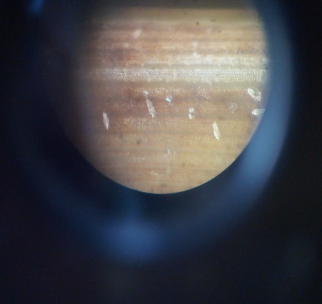 同年11月30日在廣西貴港市橋圩鎮(zhèn)在未收割的晚稻田、田邊雜草、直生稻苗、周邊田間的再生禾苗分別取樣,帶回湖南長沙進(jìn)行了鏡檢,結(jié)果發(fā)現(xiàn),田間未收被害稻株中都能找到跗線螨活體,黑褐色的稻桿、未抽出穗(黑褐色)的葉鞘內(nèi)跗線螨活體較多,且葉鞘內(nèi)的穗軸上可見到跗線螨蛻變的皮(見顯微鏡下照片)。田邊雜草、直生稻苗、周邊田間的再生禾苗中只見少量跗線螨活體。
