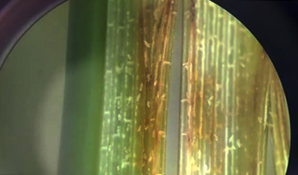 近些年水稻產(chǎn)區(qū)受到斯氏狹跗線螨等種類的為害有上升趨勢,對糧食生產(chǎn)造成嚴(yán)重?fù)p失。水稻跗線螨蟲體微小,體長僅0.1~0.3毫米,一般肉眼見不到,乳白色,主要存在水稻葉鞘內(nèi),剝開葉鞘,肉眼可見葉鞘內(nèi)壁表面似有白色粉塵,用放大鏡或雙目解剖鏡觀察,可看到很多細(xì)小的螨蟲蠕動和爬行。