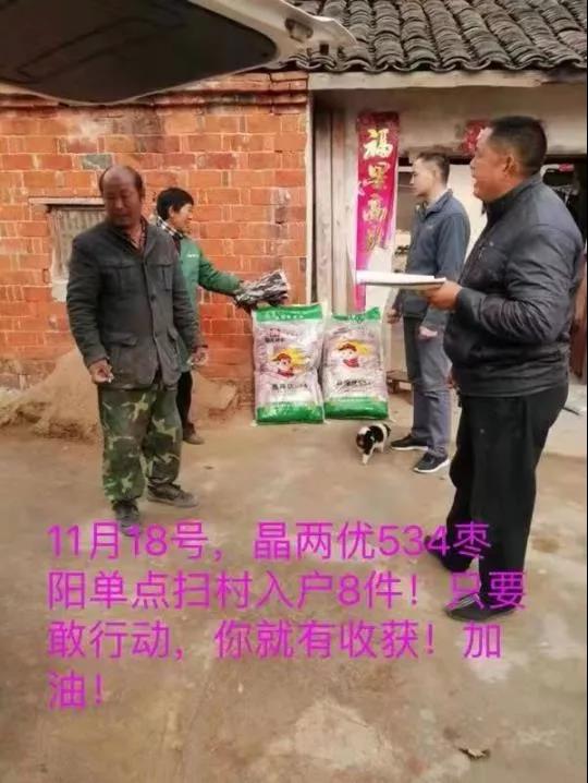 11月18日,晶兩優(yōu)534棗陽單點(diǎn)掃村入戶8件,只要敢行動(dòng),你就有收獲,加油!