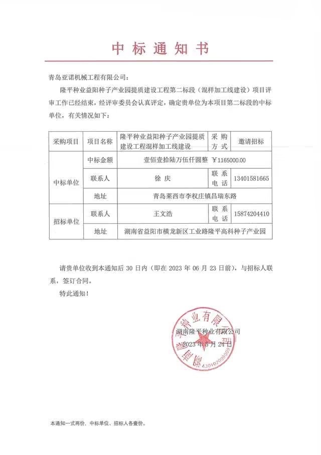 隆平種業(yè)益陽(yáng)種子產(chǎn)業(yè)園提質(zhì)建設(shè)工程項(xiàng)目招標(biāo)評(píng)審會(huì)2023年5月19日10:00時(shí)于益陽(yáng)種子產(chǎn)業(yè)園召開(kāi),經(jīng)評(píng)審,現(xiàn)將中標(biāo)相關(guān)信息予以公示。
