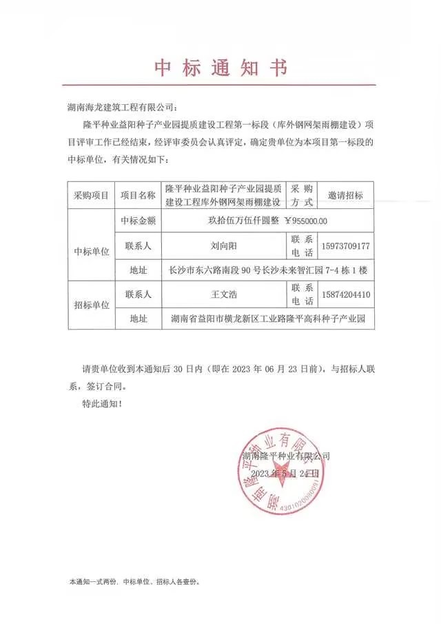 隆平種業(yè)益陽(yáng)種子產(chǎn)業(yè)園提質(zhì)建設(shè)工程招標(biāo)結(jié)果公示