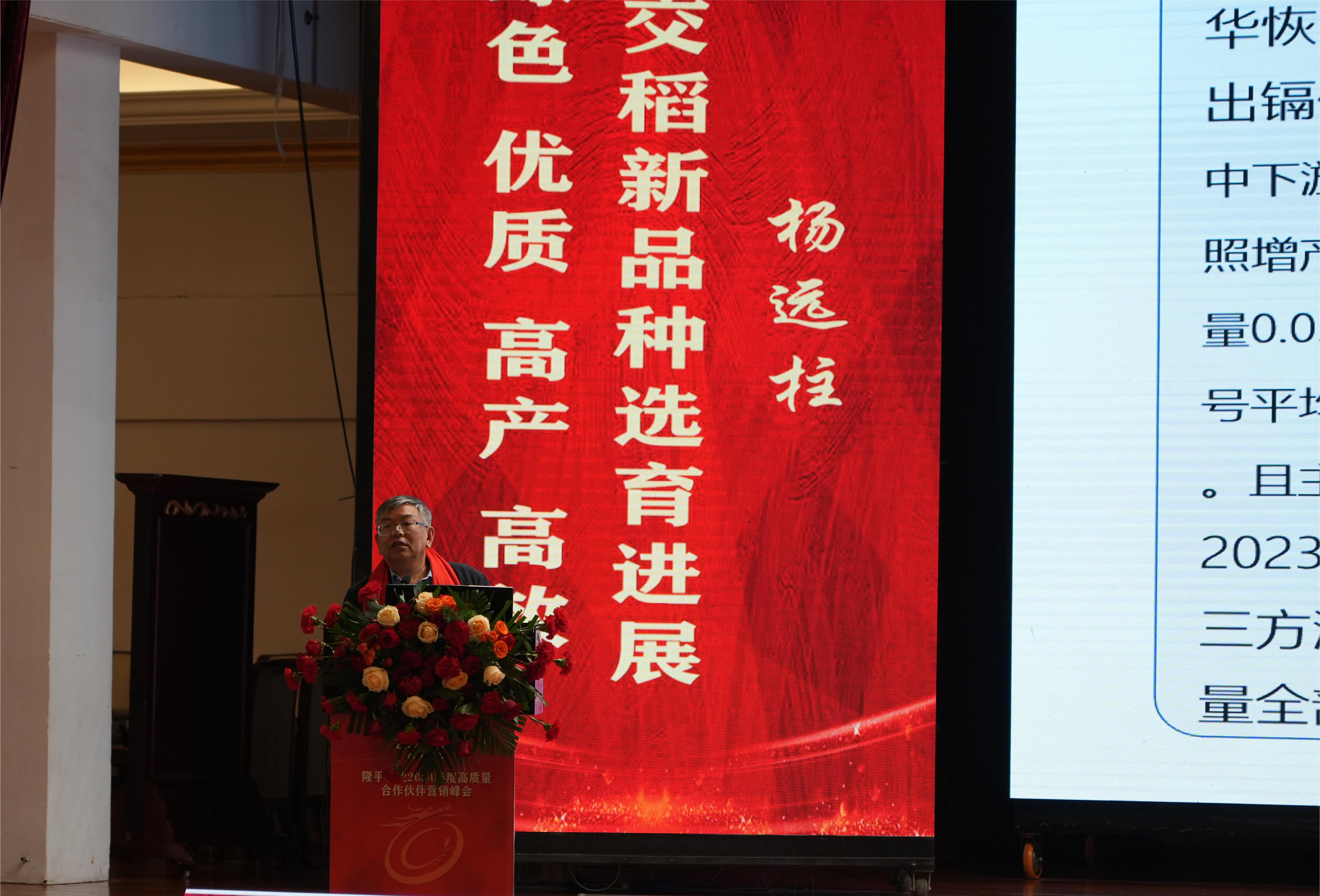 研發(fā)是隆平的核心優(yōu)勢,大會首先由隆平高科副總裁、種業(yè)科學院院長楊遠柱作《綠色優(yōu)質(zhì)高產(chǎn)高效新品種選育進展》分享,報告結(jié)合當前國際局勢與糧食安全問題闡述了綠色優(yōu)質(zhì)廣適高產(chǎn)雜交水稻的選育背景及戰(zhàn)略意義,并重點就隆平種業(yè)獨家運作的第五代大品系——颶兩優(yōu)系列,以及朝湘優(yōu)、晨鋒優(yōu)、臻蓮兩優(yōu)等系列品種特征特性及優(yōu)勢作了全面深入的闡述。楊院長充分肯定了公司后續(xù)品種的潛力,超強的品種資源進一步堅定了客戶長期與隆平種業(yè)合作的信心。