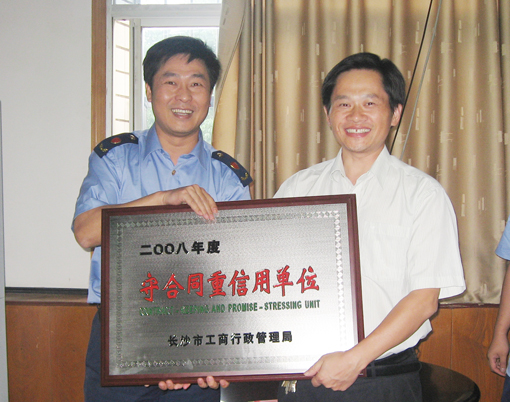 近日,從長沙市工商局傳來好消息,我公司被評為長沙市2008年度“守合同重信用單位”。 授牌儀式于10月10日上午進(jìn)行,長沙市工商局、芙蓉區(qū)工商分局和張公嶺工商所的相關(guān)領(lǐng)導(dǎo)出席了授牌儀式。儀式上,公司人事行政總監(jiān)范總代表公司對各級領(lǐng)導(dǎo)的到來表示熱烈的歡迎,并對公司的基本情況及合同管理、信用建設(shè)方面的工作情況進(jìn)行了詳細(xì)匯報(bào)。