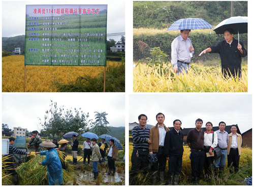 9月27日,由農(nóng)業(yè)部委托、湖南省農(nóng)業(yè)廳組織有關(guān)專家,對(duì)我公司選育的兩系雜交中稻準(zhǔn)兩優(yōu)1141湖南省漣源市古塘鄉(xiāng)塘邊村的百畝示范方進(jìn)行了現(xiàn)場(chǎng)測(cè)產(chǎn)驗(yàn)收,專家組選取長勢(shì)高、中、低三類田塊進(jìn)行現(xiàn)場(chǎng)收割、脫粒、風(fēng)干,計(jì)算濕谷和水分含量,最終折合干谷平均畝產(chǎn)805公斤。