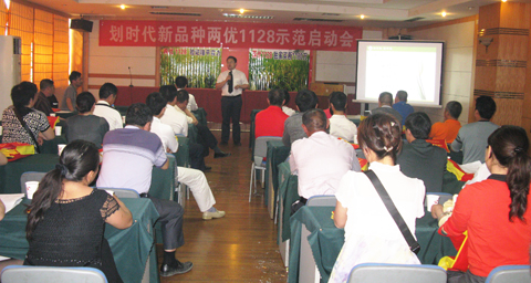 會上重點講解了兩優(yōu)1128品種特性、高產栽培技術、示范會的準備、無柜臺銷售4個方面的專業(yè)知識,“我們都是隆平人”的演講更是把每一場啟動會的氣氛推向高潮。示范啟動會的成功舉辦加深了營銷團隊對兩優(yōu)1128品種的認知程度,再一次堅定了該團隊對兩優(yōu)1128的推廣信心,提高了大家對辦好標準化示范田重要性的認識,促進了村級觀摩會的前期準備工作,提升了整個團隊的凝聚力和協(xié)同作戰(zhàn)能力!