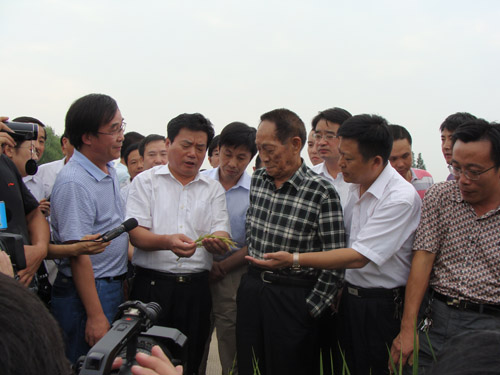 8月28日,國(guó)家雜交水稻工程技術(shù)研究中心(以下簡(jiǎn)稱雜優(yōu)中心)信陽(yáng)分中心成立并正式授牌。為此,袁隆平院士率羅孝和、馬國(guó)輝、鄧啟云、鄧小林等專家提前兩天趕到信陽(yáng),觀摩兩優(yōu)1128等由雜優(yōu)中心選育的強(qiáng)勢(shì)雜交水稻新品種的百畝田間示范表現(xiàn)。