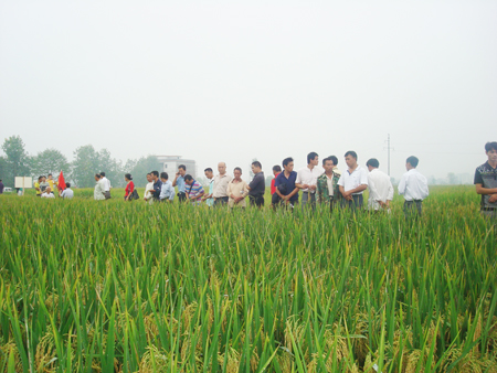 與會(huì)人員一行先乘車(chē)來(lái)到頭堂鄉(xiāng)七里村觀摩兩優(yōu)1128、準(zhǔn)兩優(yōu)608、Y兩優(yōu)19等品種,七里村是武岡市文華植保專(zhuān)業(yè)合作社“三統(tǒng)一”(統(tǒng)一品種、統(tǒng)一肥料、統(tǒng)一病蟲(chóng)害防治)示范區(qū),該村共種植兩優(yōu)1128達(dá)200多畝,集中連片的有100多畝,都是用高肥水平管理,表現(xiàn)十分突出,大穗粒數(shù)達(dá)700粒左右,預(yù)計(jì)平均畝產(chǎn)在800公斤,高產(chǎn)田塊達(dá)到900公斤;準(zhǔn)兩優(yōu)608落色好,穗大粒多,籽粒大,結(jié)實(shí)率高;Y兩優(yōu)19分蘗力強(qiáng),有效穗多,葉青籽黃,穗大料多,主穗粒達(dá)400多粒。村民代表鄧星榮興致勃勃的介紹品種的驚人表現(xiàn),與會(huì)代表熱情高漲,對(duì)巨穗稻兩優(yōu)1128表示了極度關(guān)注,紛紛拔下稻穗數(shù)粒數(shù),同時(shí)對(duì)中熟期的準(zhǔn)兩優(yōu)608、Y兩優(yōu)19也贊嘆不已。