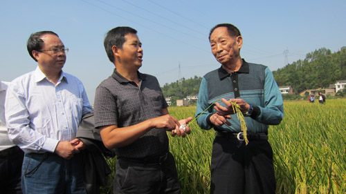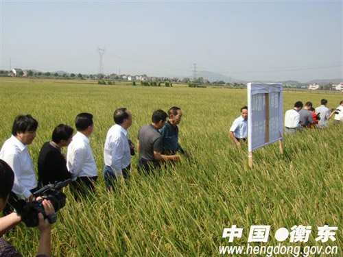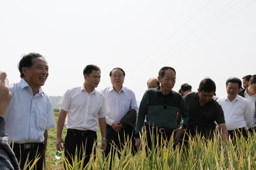 袁隆平院士深入田間,雙手扒開禾蔸,察看稻穗生長情況,不時(shí)拔下一根稻穗數(shù)一數(shù)谷粒的數(shù)量,詢問栽培種植情況,不時(shí)稱贊:“晚稻能長得這樣子,非常不簡(jiǎn)單……老百姓常規(guī)種植,上600公斤沒有一點(diǎn)問題的……國家給湖南定的增產(chǎn)任務(wù)是42億斤,如果準(zhǔn)608累計(jì)推廣1000萬畝,光這一個(gè)品種就能完成一半的增產(chǎn)任務(wù)”,一再要求陪同的廖總及其他領(lǐng)導(dǎo)一定要加強(qiáng)推廣力度,爭(zhēng)取進(jìn)入“種三產(chǎn)四”豐產(chǎn)工程。