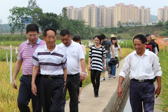 沿著田肩一路走來,展示著我司最新研發(fā)的新品種 “深08S/R1813、廣占63-2S/R1813、廣占63-4S/R1813、宣69S/R1813、新安S/R1813、Y58S/R1813、2710S/HR1128、深08S/AC206、深08S/C995、深08S/湘恢012、3455S/HR1128等”,在每個品種旁,袁院士總是喜歡停下來,用手?jǐn)堉豢|縷穗子,就像撫摸著自己的“愛子”一樣,親切而慈祥的觀察著。“咱們的第四期超級稻攻關(guān),就需要他們”,袁院士樂呵呵的說!