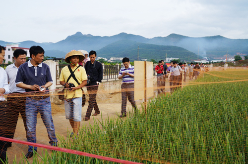 4月,海南已是流火之天。來(lái)到新品種展示基地,代理商們還來(lái)不及聽(tīng)技術(shù)專(zhuān)家講解,就已紛紛沖向田埂,尋覓自己中意的品種了。Y58S/R1813的展示田邊,大家一邊端詳其株葉形態(tài),細(xì)數(shù)分蘗和穗粒數(shù),還排隊(duì)照起了相。
