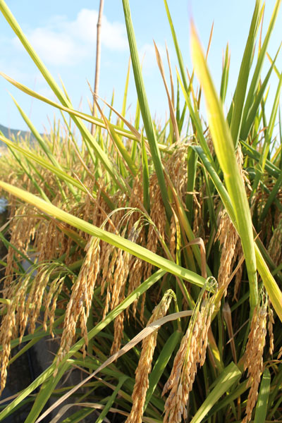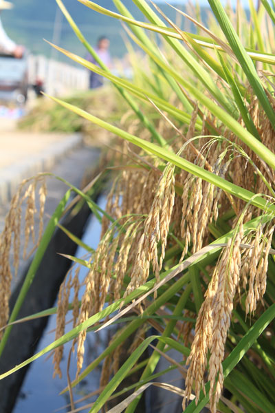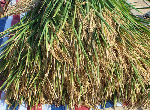 驗(yàn)收小組在深08S/R1813的示范田中隨機(jī)選取了三個(gè)測(cè)產(chǎn)點(diǎn),每個(gè)點(diǎn)劃定50平方米面積,現(xiàn)場(chǎng)收割,脫粒,共計(jì)收割面積150.08平方米,毛重為244.3公斤;折合成含水量13.5%的干谷,凈重為212.5公斤,換算成畝產(chǎn)為944公斤。