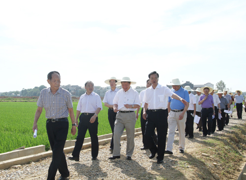 2013年7月26日,國家科技部副部長曹健林、中國科學(xué)院院士陳曉亞、中國工程院院士劉旭、陳劍平、袁隆平,會同國家科技部辦公廳、國家科技部獎勵辦公室相關(guān)領(lǐng)導(dǎo)前往我司寧鄉(xiāng)關(guān)山“兩系雜交水稻新品種展示基地”考察。湖南省副省長李友志、省科技廳、省農(nóng)科院、湖南雜交水稻研究中心相關(guān)領(lǐng)導(dǎo)陪同考察,公司總經(jīng)理廖翠猛、總農(nóng)藝師劉愛民陪同考察。