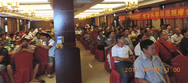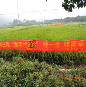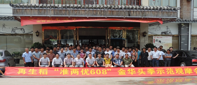 2014年8月10日上午,浙江金華市成功召開了準(zhǔn)兩優(yōu)608再生稻頭季觀摩會。一大清早,來自金華市所有縣市級、紹興諸暨市的大戶及金華市、義烏市農(nóng)業(yè)局的部分領(lǐng)導(dǎo)來到義烏市佛堂鎮(zhèn)雞毛換糖大酒店,近150人統(tǒng)一坐大巴出發(fā)來到種田大戶朱國富田間進(jìn)行了田間觀摩。