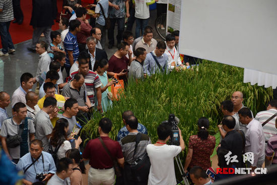 (湖南隆平高科將超級雜交稻的樣品從田間搬到展會現(xiàn)場,受到各參展商和市民的圍觀。)
