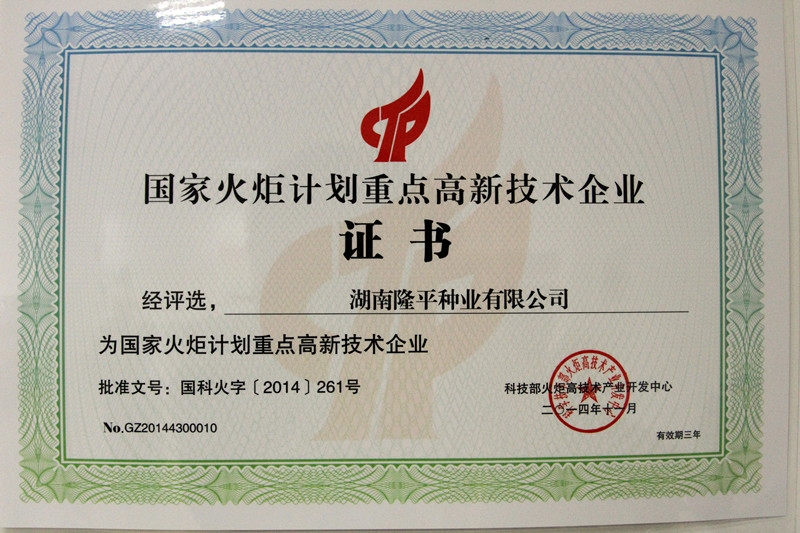 近日獲悉,公司被評(píng)為“2014年國(guó)家火炬計(jì)劃重點(diǎn)高新技術(shù)企業(yè)”,有效期三年。 2014年湖南省僅25家企業(yè)被評(píng)選上。