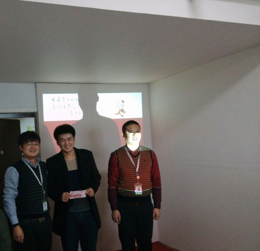 會議上講師和大家做一個小游戲進行新老互動,一個很幸運的實習生獲得獎勵,并一起合影。
