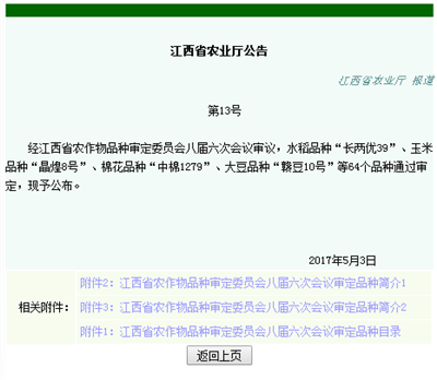2017年5月,根據(jù)湖南省農(nóng)業(yè)委員會(huì)發(fā)布的《關(guān)于2017年主要農(nóng)作物品種審定情況的公告》顯示,我公司水稻品種領(lǐng)優(yōu)華占(中抗稻瘟病,被評(píng)為湖南二等優(yōu)質(zhì)米,無(wú)一等優(yōu)質(zhì)米)通過(guò)審定,審定公告如下:
