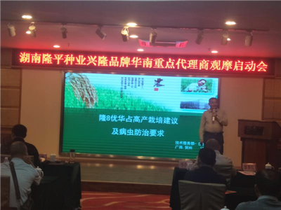 隨后,興隆品牌負(fù)責(zé)人李奎為大家講解公司發(fā)展歷程、未來(lái)發(fā)展方向以及目前種業(yè)發(fā)展的形勢(shì),并向代理商推介興隆品牌后續(xù)強(qiáng)勢(shì)品種(夢(mèng)兩優(yōu)534、簡(jiǎn)兩優(yōu)黃莉占、隆晶優(yōu)534、隆優(yōu)534、)。他表示希望大家在選擇的道路上抓住機(jī)遇,強(qiáng)大的公司、強(qiáng)勢(shì)的品種不容錯(cuò)過(guò)。